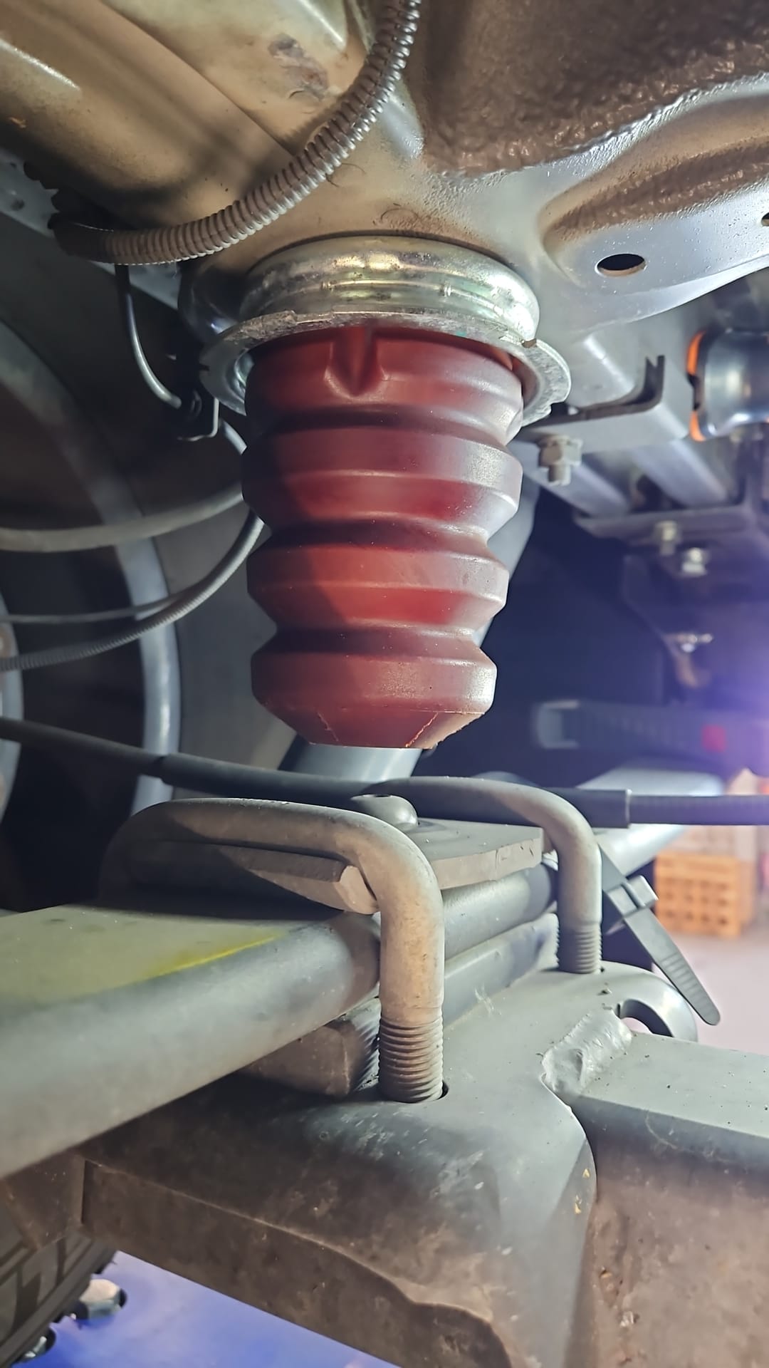 Deze rubbers vervangen de standaard aanslagblokken in de achtervering. Ze verbeteren het rijcomfort niet, maar zorgen er wél voor dat de camper minder doorzakt. Hierdoor blijft de achterkant hoger en raakt de trekhaak veel minder snel de straat.